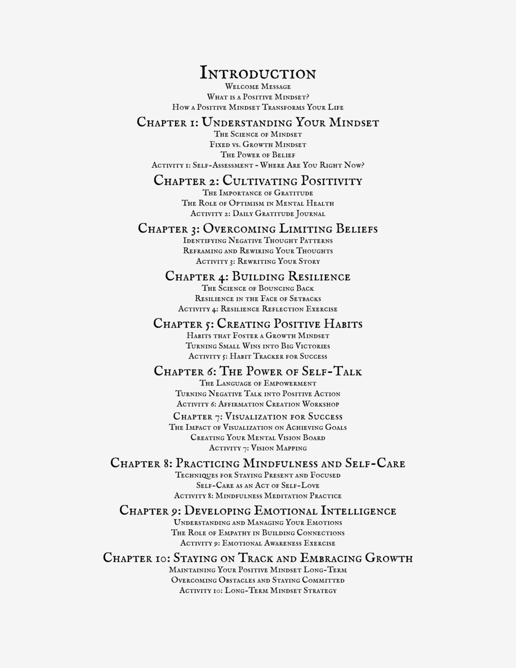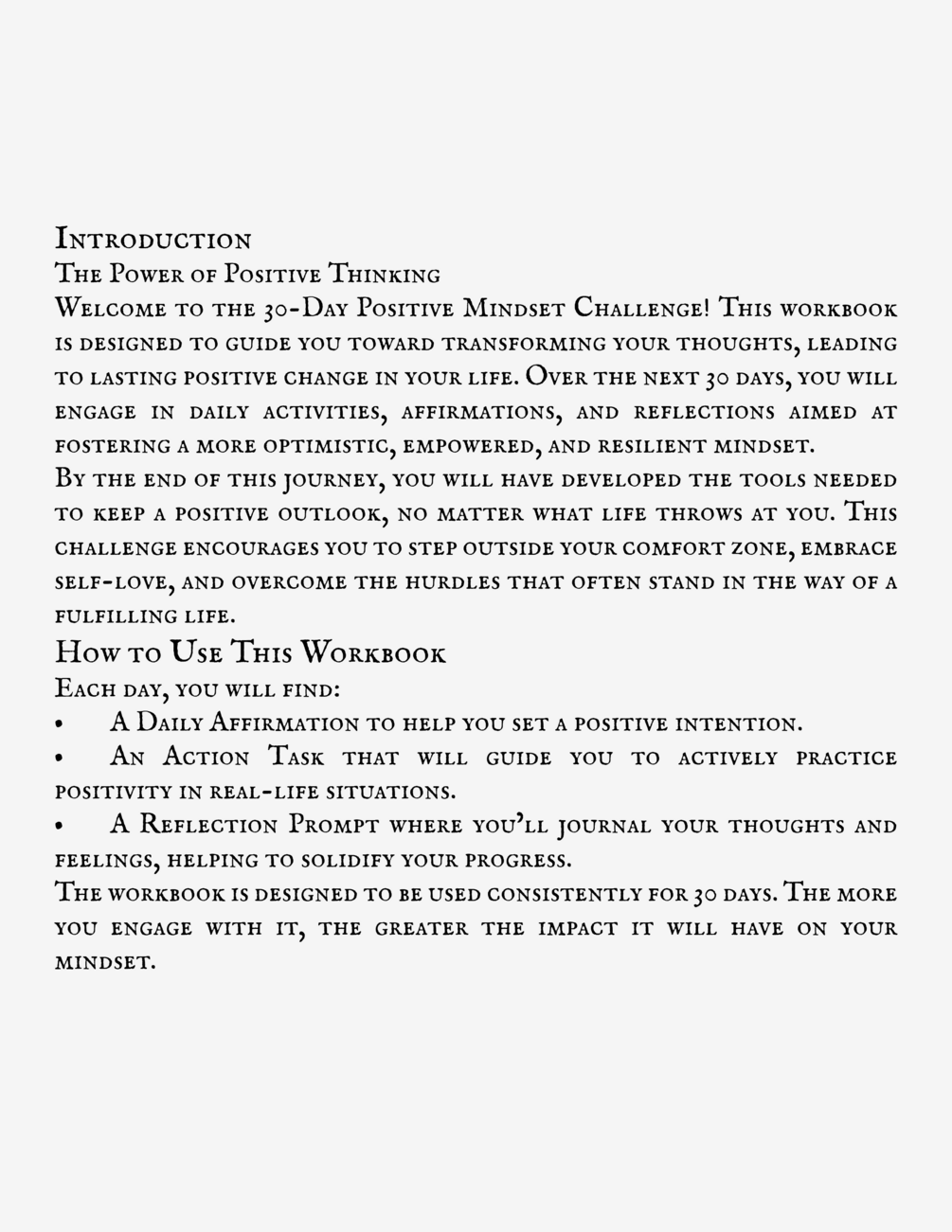 The 30-Day Positive Mindset Challenge is designed to help you build habits that foster a more positive, focused, and resilient mindset. Each day, you will practice an activity or reflection that encourages gratitude, mindfulness, self compassion, and growth. The goal is to shift your thinking, overcome negative self talk, and enhance your overall well being.