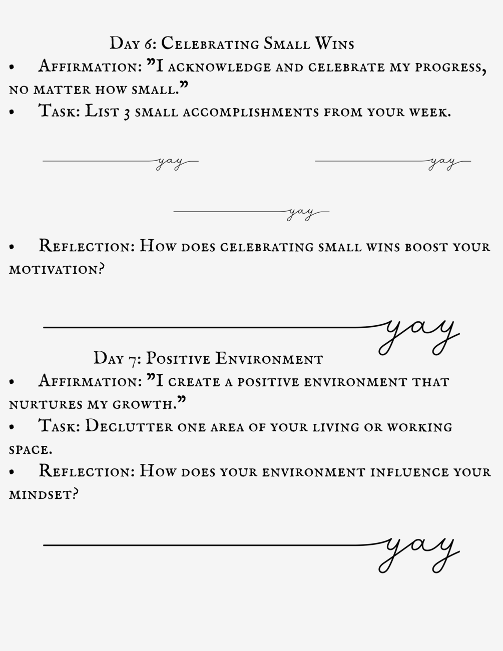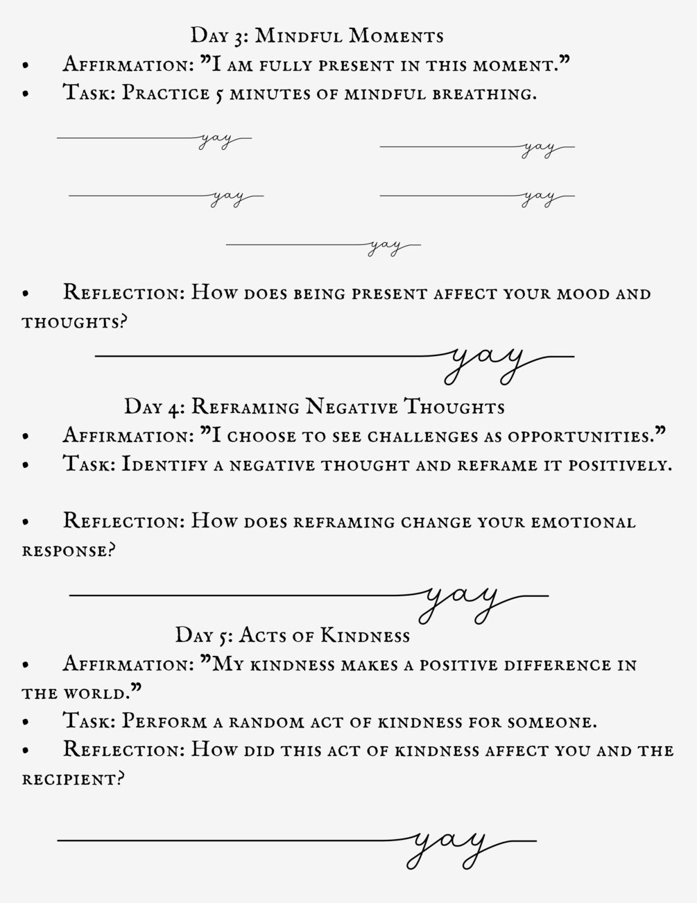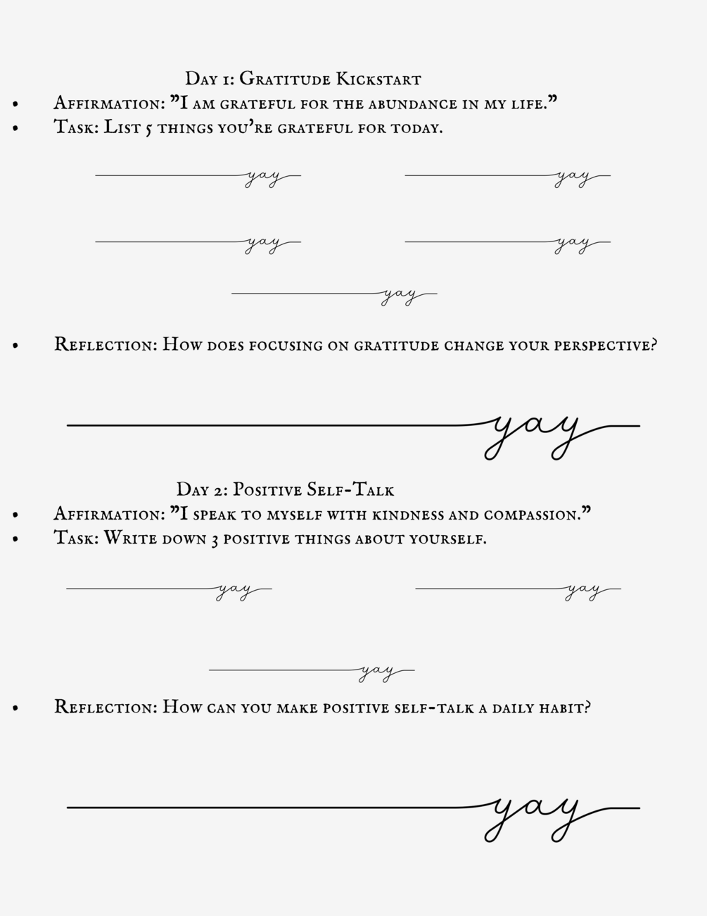 Transform your mindset and cultivate a more positive, resilient, and empowered you with this 30-day challenge. Each day, you’ll engage in activities designed to foster gratitude, self love, mindfulness, and growth. Whether it’s reflecting on what you're grateful for, practicing self compassion, stepping out of your comfort zone, or learning how to overcome challenges, this challenge provides practical steps to help you shift your thinking and develop a lasting positive mindset.